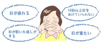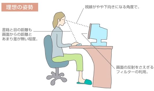 対策法は、まばたきの回数を意識的に多くするとともに、ディスプレイが目線より下になるよう配置する、適度に目を休める、空気が乾燥しないようにする、などです。