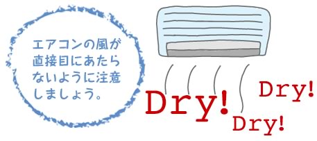 夏は比較的に湿度が高いですが暑い日、エアコンの効いた室内にこもりっきりでテレビを見たり、ゲームをしたり、パソコンばかりしていると目も乾きやすくなり、ドライアイの症状を引き起こしやすくなります。とくにエアコンの風が直接目にあたらないように注意しましょう。