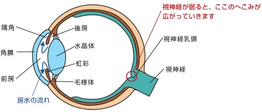 緑内障は眼圧(眼球内の水圧)が上昇するなどの原因で視神経が障害を受け、徐々に視野が狭くなっていく病気です。昔は「青そこひ」とも言われ、白内障「白そこひ」と並んで失明率の高い病気でした。