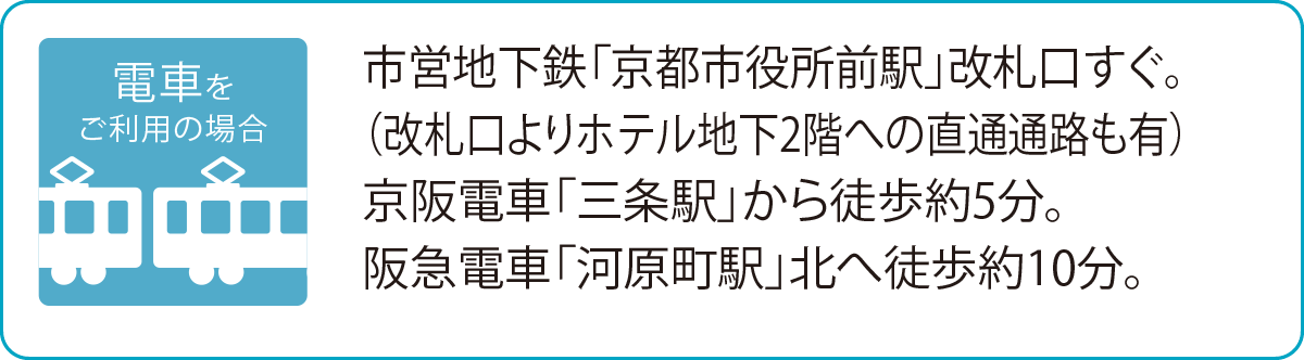 (市営地下鉄「京都市役所前駅」改札口すぐ。(改札口よりホテル地下2階へ直通通路も有)