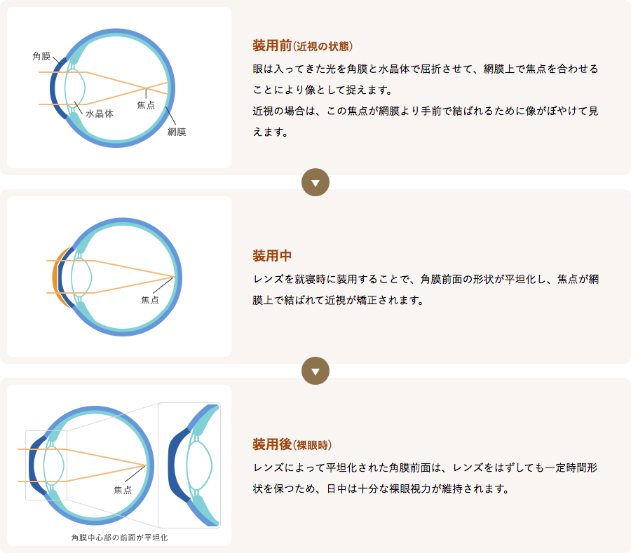 その特殊なデザインのコンタクトレンズが、寝ている間に角膜形状を平らに矯正することで、近視の改善を行います。